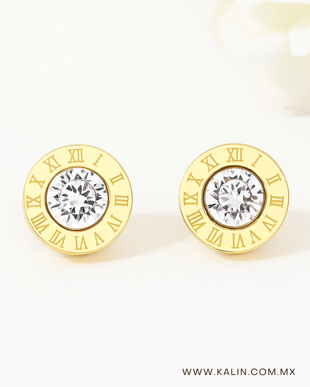 • Aretes De Botón Con Diseño De Diamante Y Números Romanos Color: AMARILLO ORO Altura: 0.9 cm Ancho: 0.9 cm
