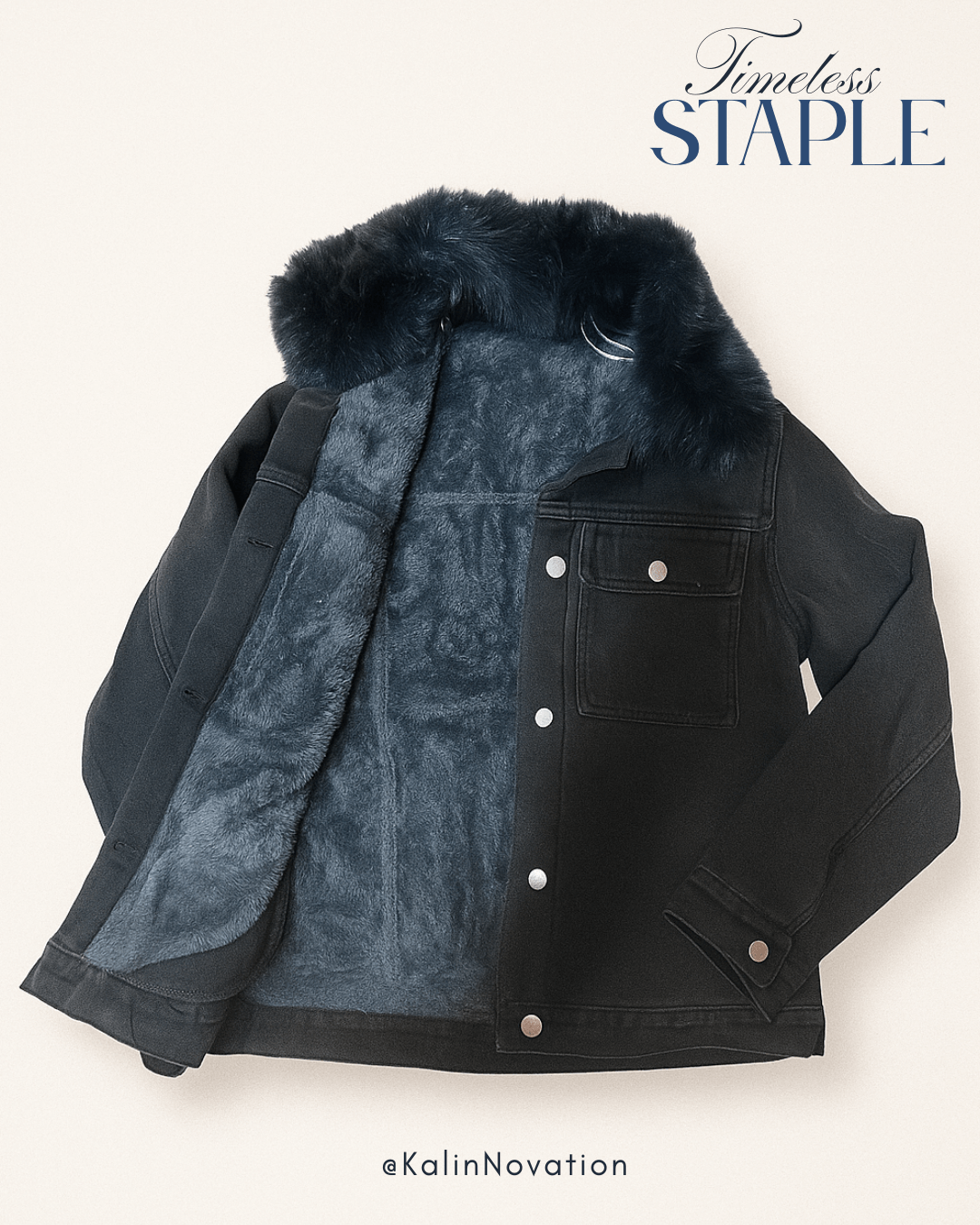 • Talla: Extra Grande Tela: Mezclilla negra afelpada con cuello peludo desmontable Color: Negro