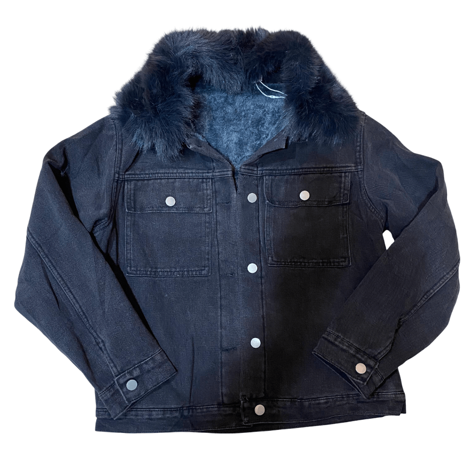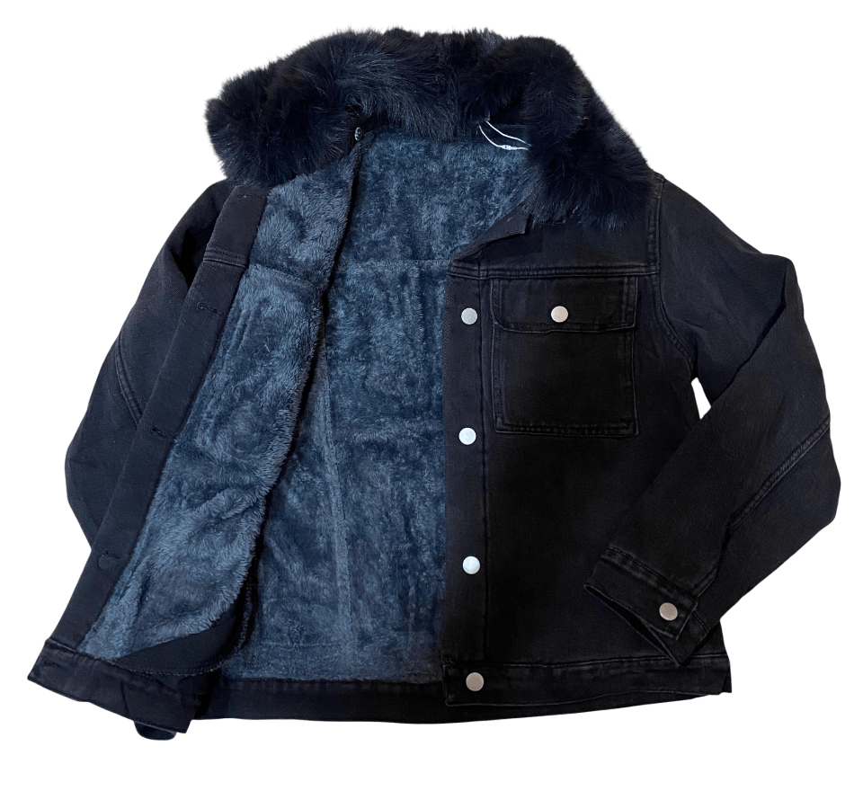 • Talla: Grande Tela: Mezclilla negra afelpada con cuello peludo desmontable Color: Negro