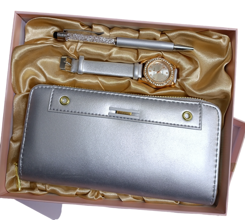 • Se entrega en cajita rosa Color: Plata Incluye: Cartera 1 cierre, reloj y pluma.