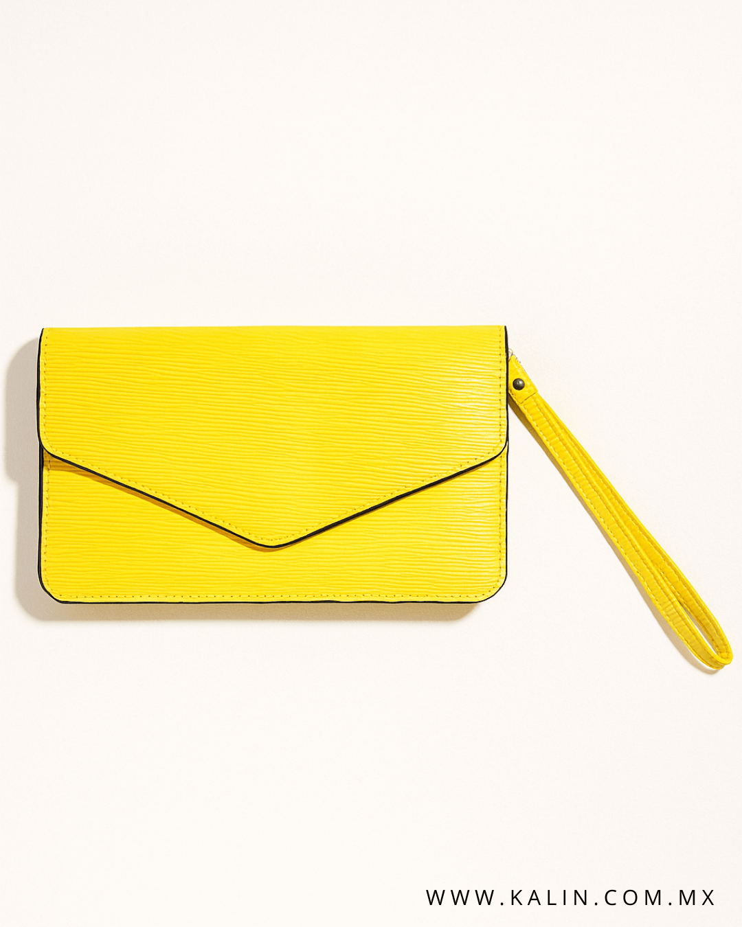 • Color amarillo con interior café Diseño tipo sobre Dimensiones: 21 cm largo x 12 cm alto Material sintético Otra información: Correa adicional.
