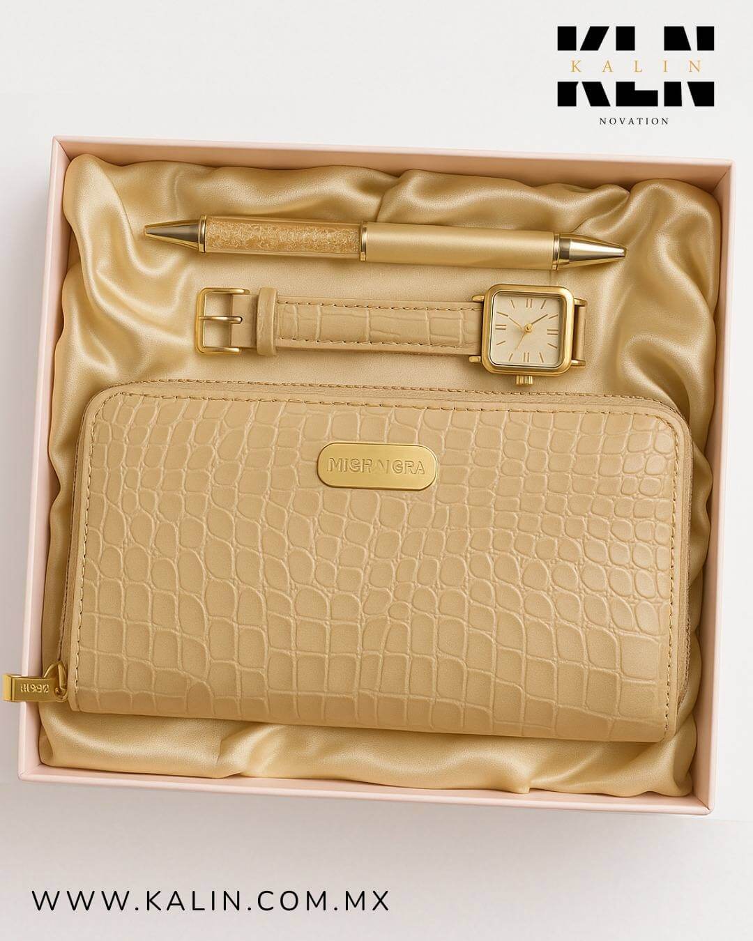 • Se entrega en cajita rosa Color: Nude Charol Incluye: Cartera 1 cierre, reloj y pluma.