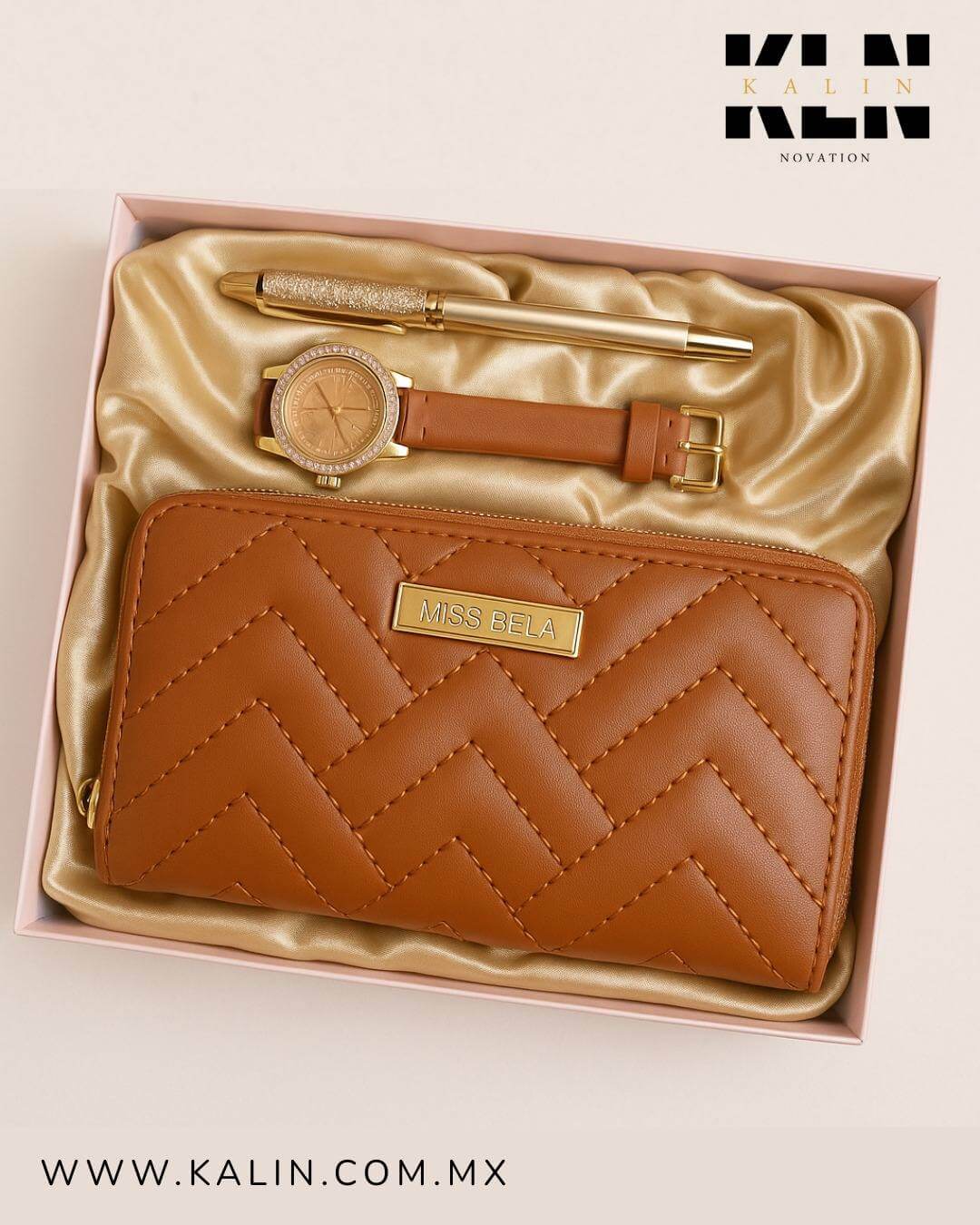 • Se entrega en cajita rosa Color: Marrón Incluye: Cartera 1 cierre, reloj y pluma.
