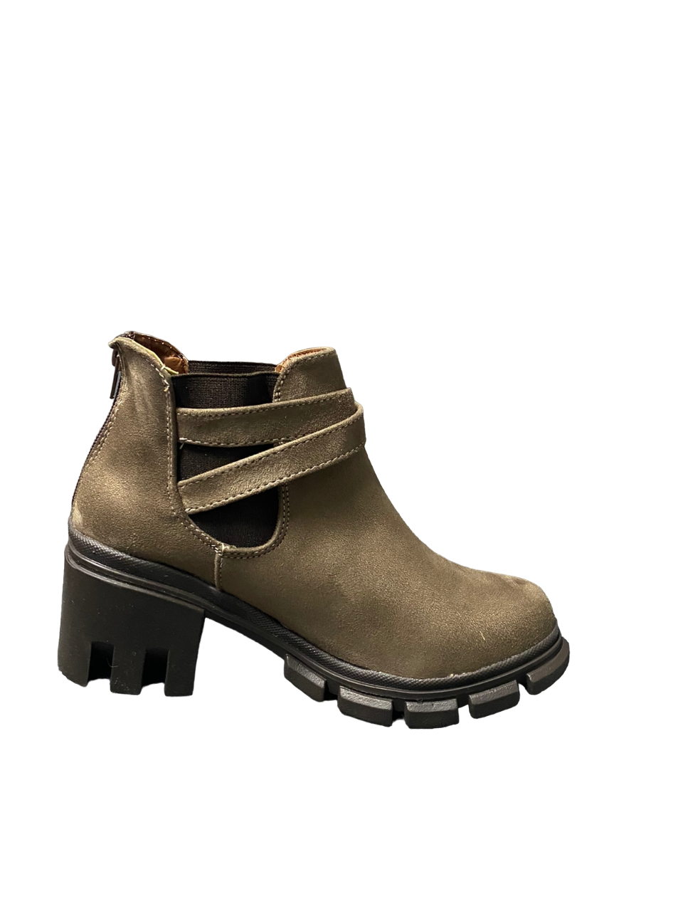 • Material: Durazno Color: Topo Modelo: Botín con hebilla Tacón: 6 cm