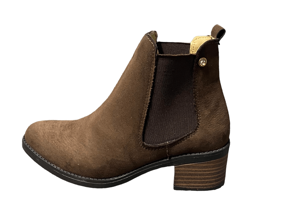 • Material: Piel durazno Color: Café Modelo: Botín café con elástico